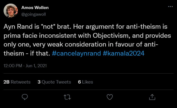 Even just the the first of these considerations—the consideration about universalism—more or less swallows up Rand’s consideration in favour of anti-theism.